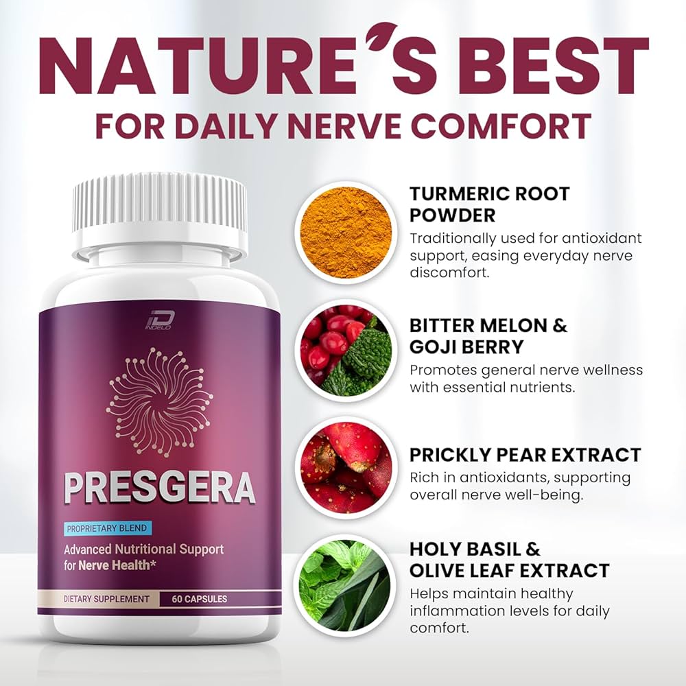 Presgera is a dietary supplement designed to support individuals dealing with neuropathy discomfort. It combines well-studied ingredients that aim to calm nerve irritation, improve circulation, and encourage long-term nerve health. The formula targets common issues linked to neuropathy, such as burning, tingling, or tension that interfere with daily activities.